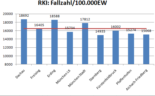 Im Vergleich mit den Nachbarlandkreisen steht nur Pfaffenhofen bei den Verstorbenen pro 100.000 Einwohner noch schlechter da als der Landkreis Dachau. Deutlich geringer ist der Wert für den Nachbarlandkreis Fürstenfeldbruck.