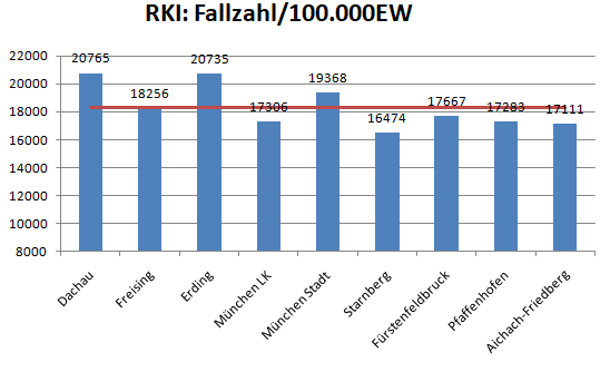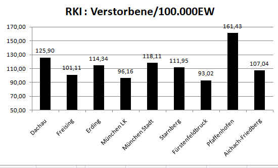 Im Vergleich mit den Nachbarlandkreisen steht nur Pfaffenhofen bei den Verstorbenen pro 100.000 Einwohner noch schlechter da als der Landkreis Dachau. Deutlich geringer ist der Wert für den Nachbarlandkreis Fürstenfeldbruck.