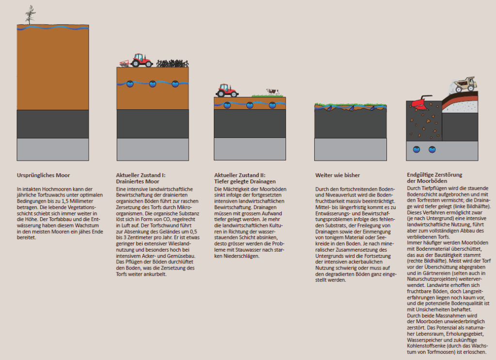 Die Degeneration, der Abbau, des Moosboden ist Fakt. Die Furchtbarkeit durch die dünne Humusschicht nimm mehr und mehr ab. Im Grunde kann man ausrechnen, wann keine Landwirtschaft mehr im Dachauer Moos möglich ist. Es ist einfach einen Frage der Zeit. Schlimmer noch. Durch falsche Bewirtschaftung z.B. durch Tiefpflügen werden untere Schichten verstärkt der Oxidation ausgesetzt. Und dem immer wieder durchgeführten „Räumen“ von Wassergräben um vermeintlich Flächen „trocken“ zu halten. Aber je mehr die landwirtschaftlichen Kulturen in Richtung der wasserstauenden Schicht absinken, desto grösser werden die Probleme mit Stauwasser nach starken Niederschlägen. Ein Teufelskreis, der letztlich zum kompletten Verlust des fruchtbaren Boden führt. Nicht umsonst spricht man vom „Schutzgut Boden“ und müsste höchste Priorität haben.