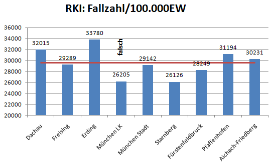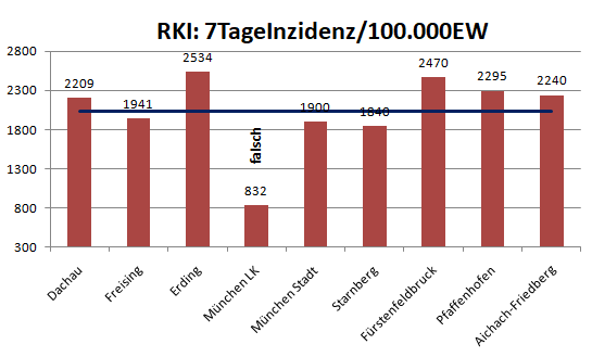 Der Landkreis Dachau liegt diese Woche mit einer Inzidenz von 2209 über dem im Mittel der Nachbarlandkreise mit 2029. Der Wert für den Landkreis München ist seit Tagen falsch, wie auch in der SZ berichtet.