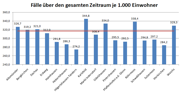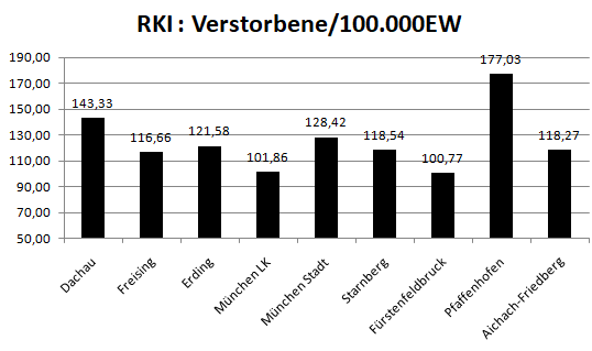 Im Vergleich mit den Nachbarlandkreisen steht nur Pfaffenhofen bei den Verstorbenen pro 100.000 Einwohner noch schlechter da als der Landkreis Dachau. Deutlich geringer ist der Wert für den Nachbarlandkreis Fürstenfeldbruck.