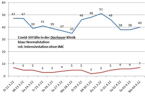 Die Grafik ist immer noch auf dem Stand vom 7.2.22, eine Aktualisierung ergibt keine plausiblen Werte. Die Zahl der Genesen wurde über einen längeren Zeitraum in Dachau nicht mehr aktualisiert, seitdem ergeben neue Zahlen keinen Sinn.