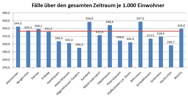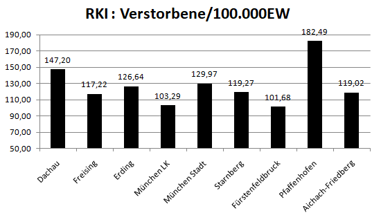Im Vergleich mit den Nachbarlandkreisen steht nur Pfaffenhofen bei den Verstorbenen pro 100.000 Einwohner noch schlechter da als der Landkreis Dachau. Deutlich geringer ist der Wert für den Nachbarlandkreis Fürstenfeldbruck.