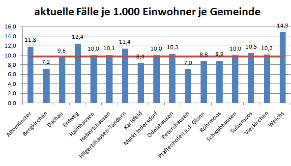 Der aktuelle Stand der Gemeinden. Der Gemeindedurchschnitt liegt bei 9,7 Fällen pro 1.000 Bürger.