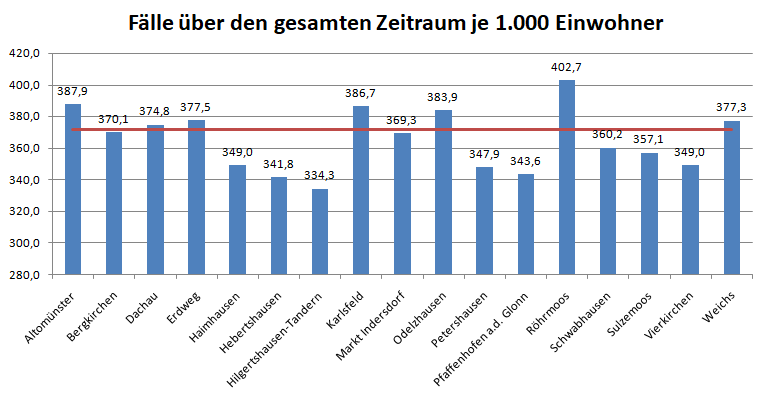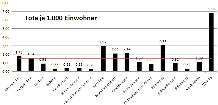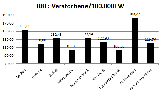 Im Vergleich mit den Nachbarlandkreisen steht nur Pfaffenhofen bei den Verstorbenen pro 100.000 Einwohner noch schlechter da als der Landkreis Dachau. Deutlich geringer ist der Wert für den Nachbarlandkreis Fürstenfeldbruck.