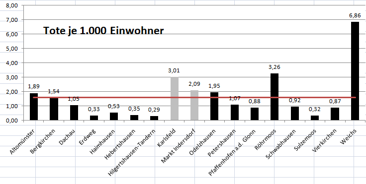 Im Vergleich mit den Nachbarlandkreisen steht nur Pfaffenhofen bei den Verstorbenen pro 100.000 Einwohner noch schlechter da als der Landkreis Dachau. Deutlich geringer ist der Wert für den Nachbarlandkreis Fürstenfeldbruck.
