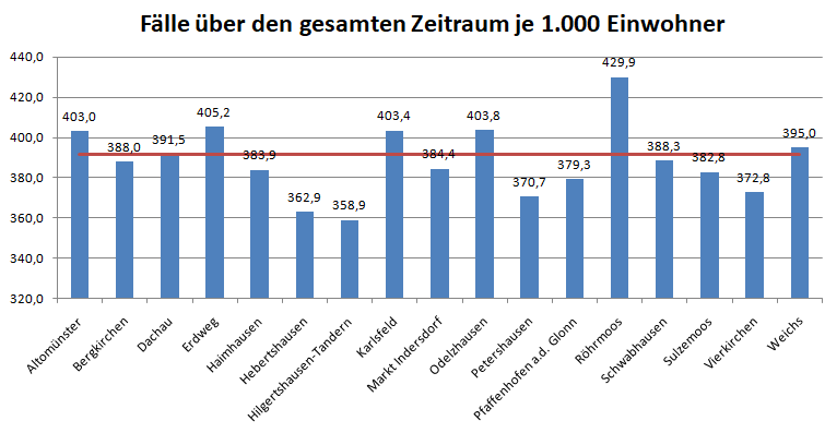 In Weichs ist die Rate 23,7 mal so hoch wie in Hilgertshausen-Tandern (bei Veränderungen gegenüber der Vorwoche sind die Balken grau hinterlegt).