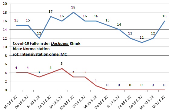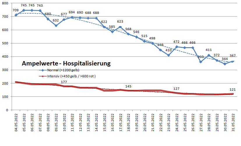Die bayernweite Intensivbettenbelegung ist geringfügig auf 121 gesunken (Vorwoche 127). Die Zahl der Patienten auf der Normalstation ist gegenüber der Vorwoche um über 100 zurückgegangen.