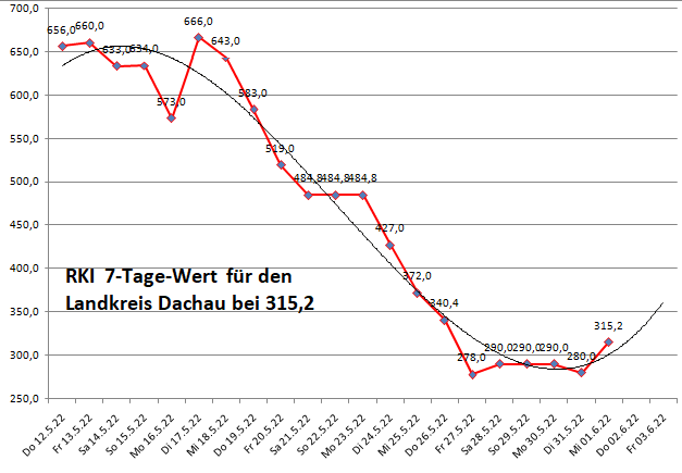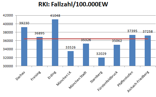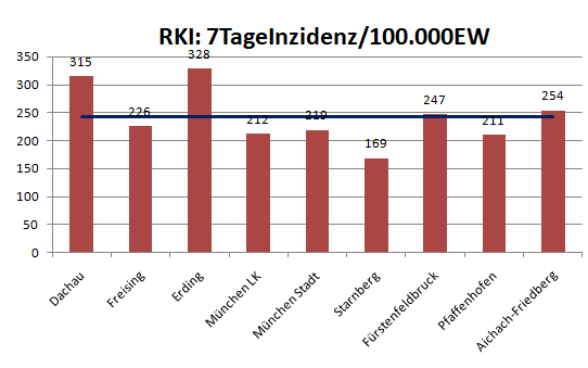 Der Landkreis Dachau liegt diese Woche mit einer Inzidenz von 315 wieder über dem im Mittel der Nachbarlandkreise mit 242. Der Wert für Starnberg ist wieder falsch, dort wurde anscheinend nichts ans RKI gemeldet.