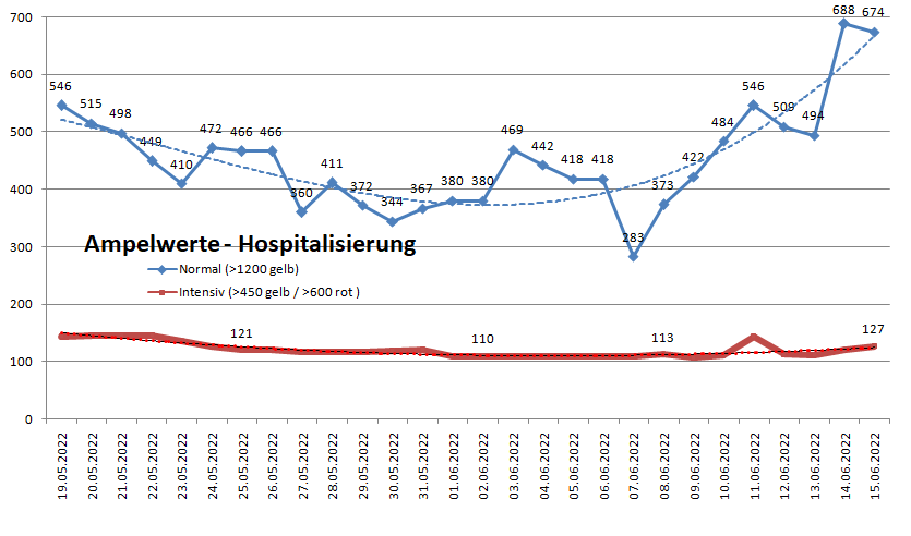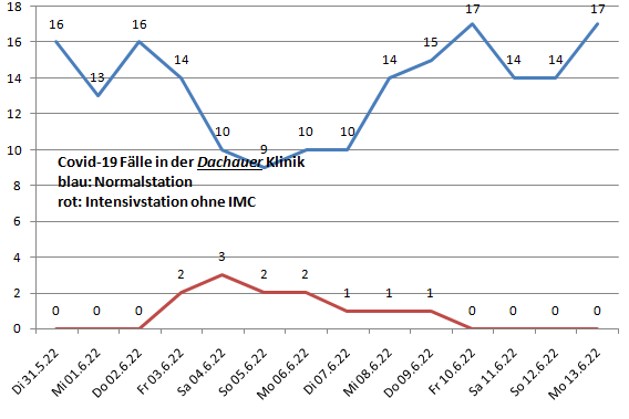 Die bayernweite Intensivbettenbelegung liegt bei 127, sie zieht in der Regel der blauen Kurve mit 1-2 Wochen Zeitverzögerung nach. Die Zahl der Patienten auf der Normalstation ist gegenüber der Vorwoche um ca. 400 gestiegen.