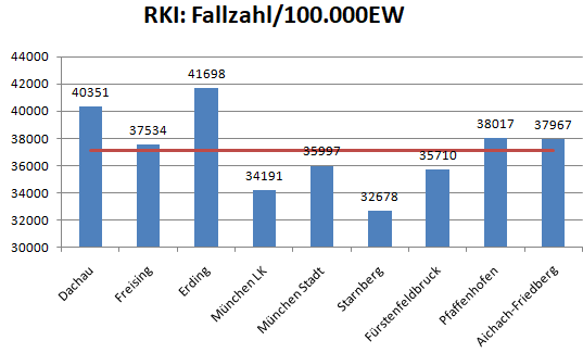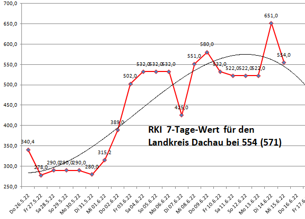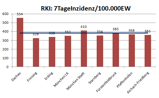 Der Landkreis Dachau liegt diese Woche mit einer Inzidenz von 554 (tatsächlich 571) weit über dem Mittel der Nachbarlandkreise mit 383.