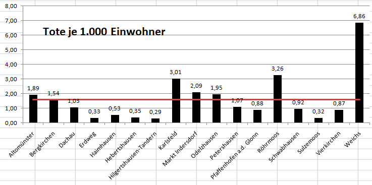 Im Vergleich mit den Nachbarlandkreisen steht nur Pfaffenhofen bei den Verstorbenen pro 100.000 Einwohner noch schlechter da als der Landkreis Dachau. Deutlich geringer ist der Wert für den Nachbarlandkreis Fürstenfeldbruck.