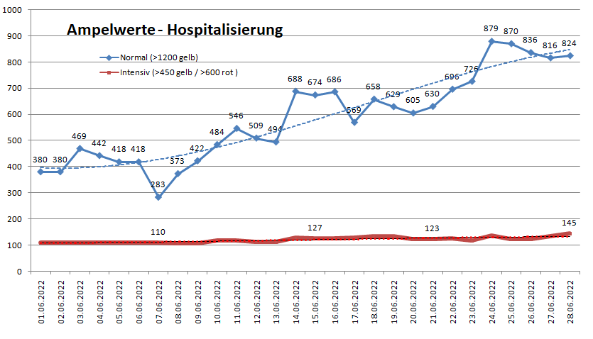 Die bayernweite Intensivbettenbelegung liegt bei 145 (123). in Bayern liegen 824 (630) Patienten auf der Normalstation.