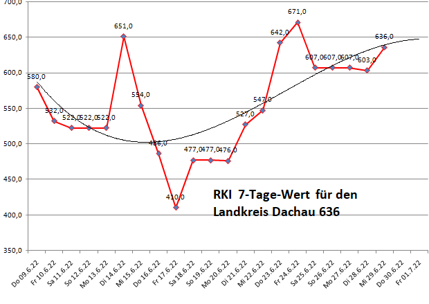 Die Zahlen zeigen die Gemeinden die vom Durchschnitt 408,0 abweichen. Der Stand ist von letzter Woche, die letzte Aktualisierung auf der Seite des Landratsamtes ist vom 20.6.22