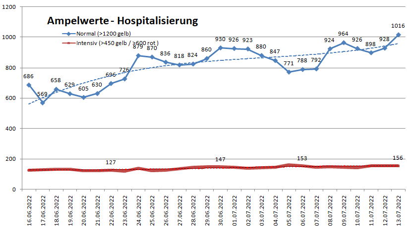 Letztmalig wurde der heutige Wert mit 1095 am 13.4.22 übertroffen. Damals lag die 7-Tage Inzidenz bei 1204, am 22.3. lagen wir bei 2.342.