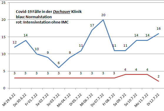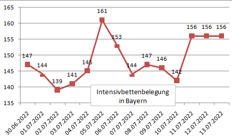 Die bayernweite Intensivbettenbelegung liegt bei 156 (161). in Bayern liegen 1016 (771) Patienten auf der Normalstation.