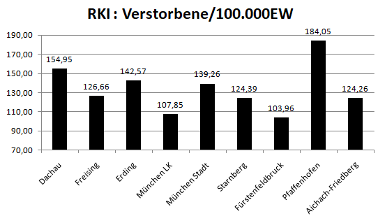 Im Vergleich mit den Nachbarlandkreisen steht nur Pfaffenhofen bei den Verstorbenen pro 100.000 Einwohner noch schlechter da als der Landkreis Dachau. Deutlich geringer ist der Wert für den Nachbarlandkreis Fürstenfeldbruck.