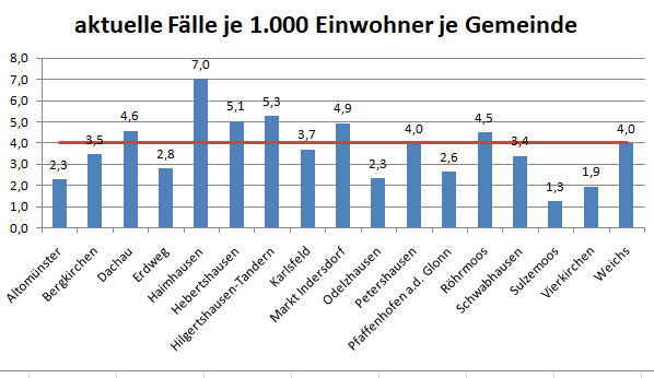 Der Stand der Gemeinden vom 30.6., neue Zahlen auf der Seite des Landratsamtes gibt es nach 5 Wochen immer noch nicht. Der Gemeindedurchschnitt lag bei 3,8 Fällen pro 1.000 Bürger.