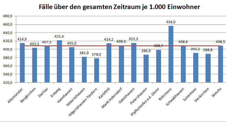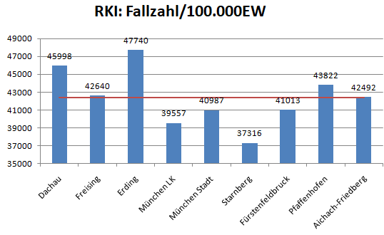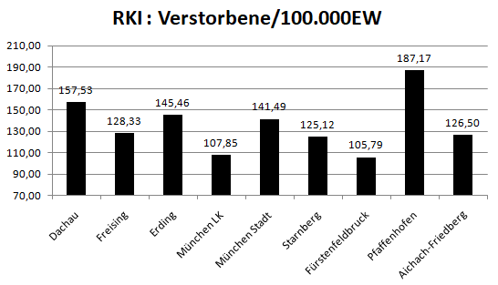 Im Vergleich mit den Nachbarlandkreisen steht nur Pfaffenhofen bei den Verstorbenen pro 100.000 Einwohner noch schlechter da als der Landkreis Dachau. Deutlich geringer ist der Wert für den Nachbarlandkreis Fürstenfeldbruck.