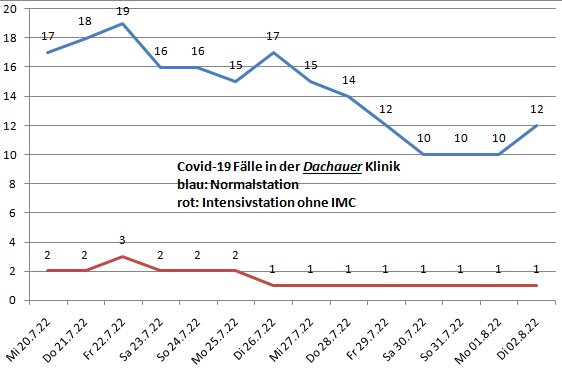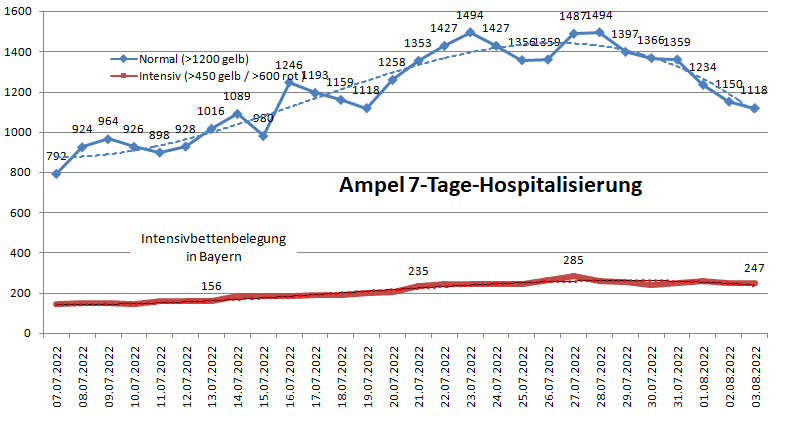 Die bayernweite Intensivbettenbelegung liegt bei 247 (285). in Bayern kamen in den letzten 7 Tagen 1118 (1487) Patienten auf die Normalstation.