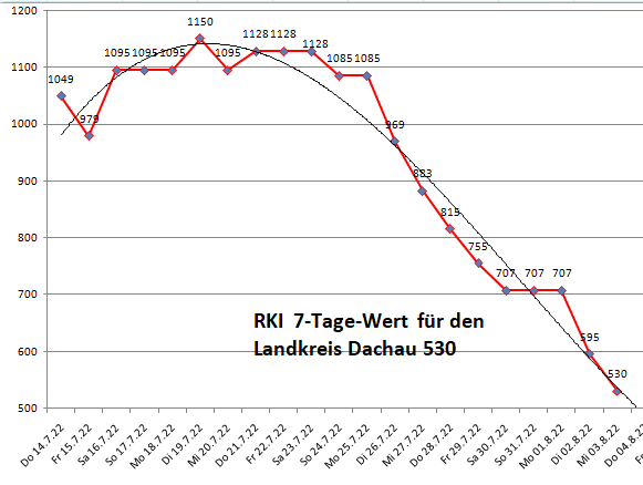 Die Zahlen zeigen die Gemeinden die vom Durchschnitt 408,0 abweichen. Der Stand ist von letzter Woche, die letzte Aktualisierung auf der Seite des Landratsamtes ist vom 30.6.22