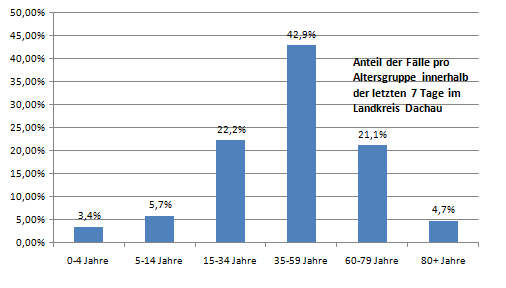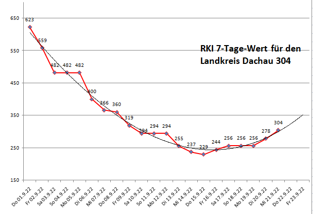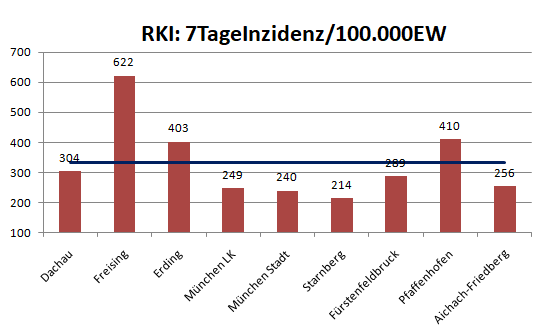 Der Landkreis Dachau liegt diese Woche mit einer Inzidenz von 304 unter dem Mittel der Nachbarlandkreise mit 332. Dieser Wert wird hauptsächlich durch die Spitzenwerte Freising und Erding beeinflusst. Diese beiden Landkreise sind noch die Folgen der Volksfeste beeinflusst.