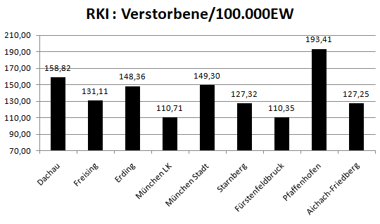 Im Vergleich mit den Nachbarlandkreisen steht nur Pfaffenhofen bei den Verstorbenen pro 100.000 Einwohner noch schlechter da als der Landkreis Dachau. Deutlich geringer ist der Wert für den Nachbarlandkreis Fürstenfeldbruck.