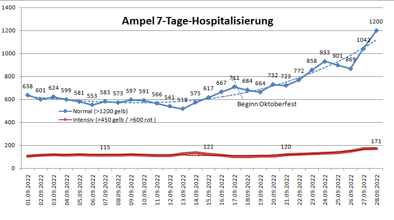 Ungefähr 2 Wochen nach Ende des jeweiligen Volksfest wurde in den Landkreisen der Spitzenwert erreicht. Für das Oktoberfest ist also um den 20.10.22 ein Spitzenwert für München und seine Nachbarlandkreise zu erwarten. Bei den Landkreisvergleichen zeigt sich jetzt schon, dass bei den direkten Nachbarn zu München die Werte ebenfalls steigen. Die Hospitalisierungen steigen rasant, würde die Ampel noch gelten wäre ab morgen Stufe „Gelb“ erreicht.