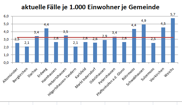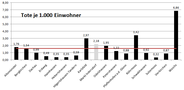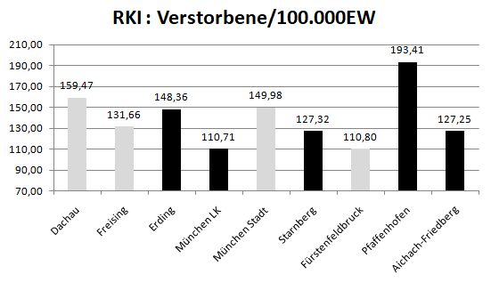 Im Vergleich mit den Nachbarlandkreisen steht nur Pfaffenhofen bei den Verstorbenen pro 100.000 Einwohner noch schlechter da als der Landkreis Dachau. Deutlich geringer ist der Wert für den Nachbarlandkreis Fürstenfeldbruck. Veränderte Werte gegenüber der Vorwoche in grau.