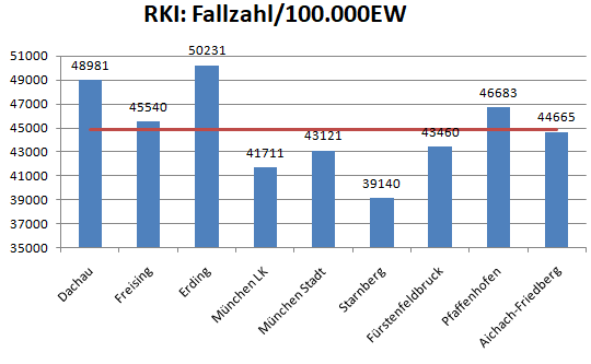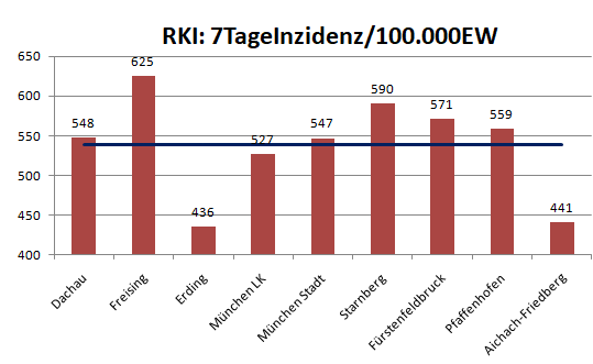 Der Landkreis Dachau liegt diese Woche mit einer Inzidenz von 548304 unter dem Mittel der Nachbarlandkreise mit 538. München hat ausgehend von einem sehr viel niedrigeren Niveau Dachau eingeholt.