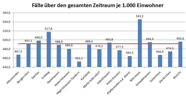 In Weichs ist die Rate 21,4 mal so hoch wie in Sulzemoos (bei Veränderungen sind die Balken grau hinterlegt).