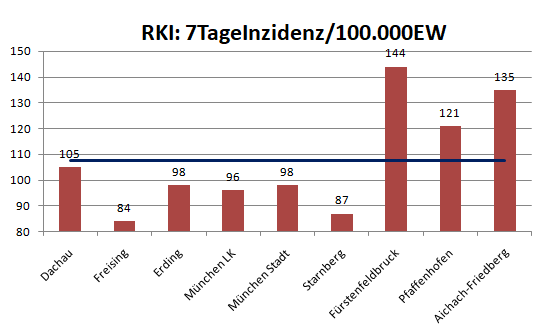 Offensichtlich wurde der Dachauer Wert heute nicht aktualisiert, hinter der Inzidenz von 105 muss also ein dickes Fragezeichen stehen.