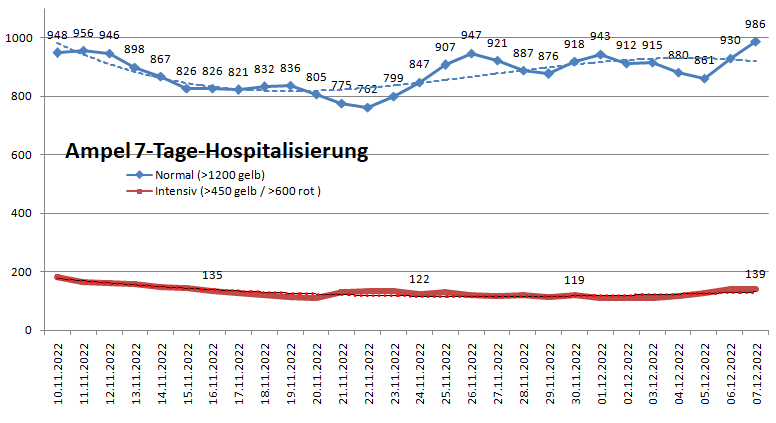 In Bayern kamen in den letzten 7 Tagen 986 (876/799) Patienten zusätzlich auf die Normalstation. In Klammern jeweils die Werte der Vorwoche.