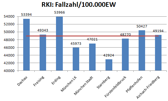 - liegen die Fallzahlen in Dachau pro Kopf Tausende über den Nachbarlandkreisen (Ausnahme Erding)?