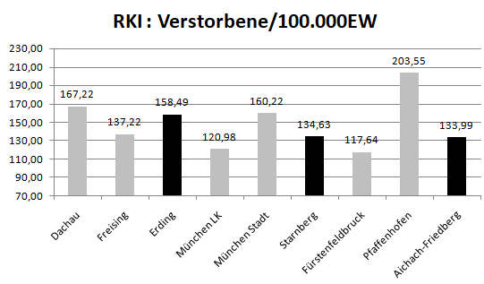 Im Vergleich mit den Nachbarlandkreisen steht nur Pfaffenhofen bei den Verstorbenen pro 100.000 Einwohner noch schlechter da als der Landkreis Dachau. Deutlich geringer ist der Wert für den Nachbarlandkreis Fürstenfeldbruck. Veränderte Werte gegenüber der Vorwoche in grau.