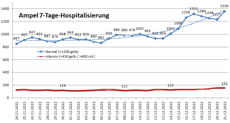 In Bayern kamen in den letzten 7 Tagen 1356 (1003/986 /876/799) Patienten zusätzlich auf die Normalstation. In Klammern jeweils die Werte der Vorwoche.