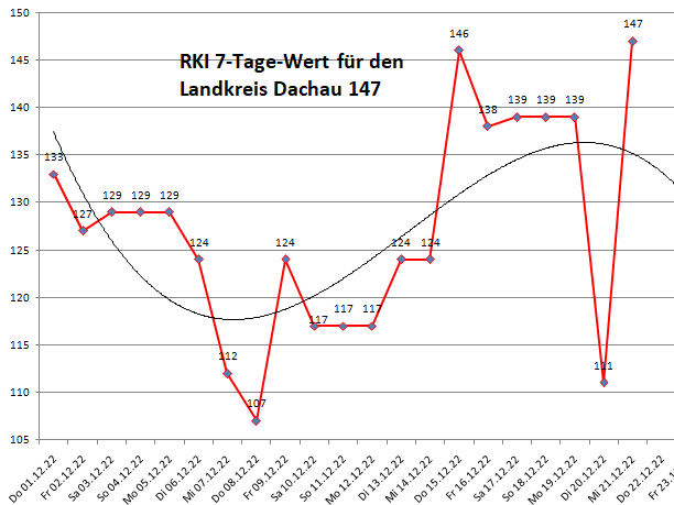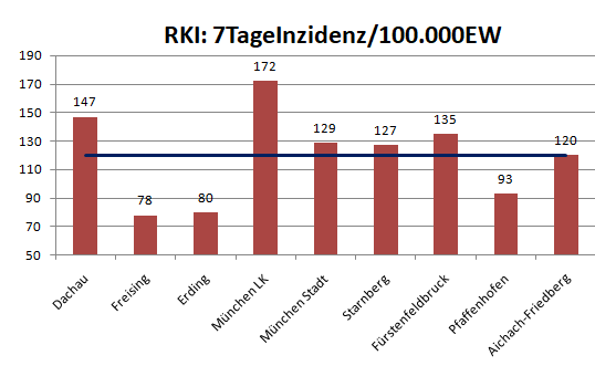 Der Landkreis Dachau liegt diese Woche mit einer Inzidenz von 147 (124/112/128) über dem Mittel der Nachbarlandkreise mit 120 (111/95/93).
