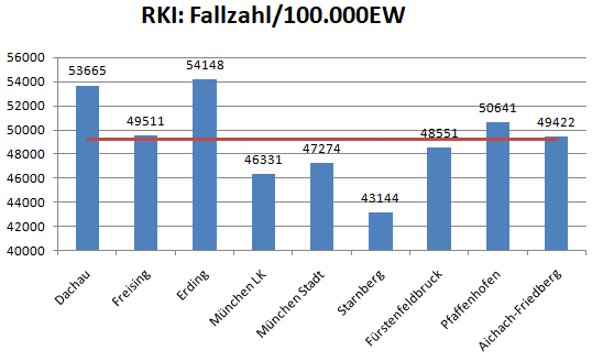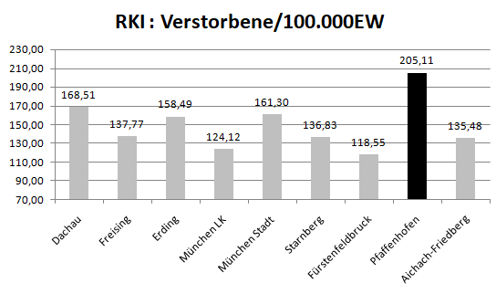 Im Vergleich mit den Nachbarlandkreisen steht nur Pfaffenhofen bei den Verstorbenen pro 100.000 Einwohner noch schlechter da als der Landkreis Dachau. Deutlich geringer ist der Wert für den Nachbarlandkreis Fürstenfeldbruck. Veränderte Werte gegenüber der Vorwoche in grau.