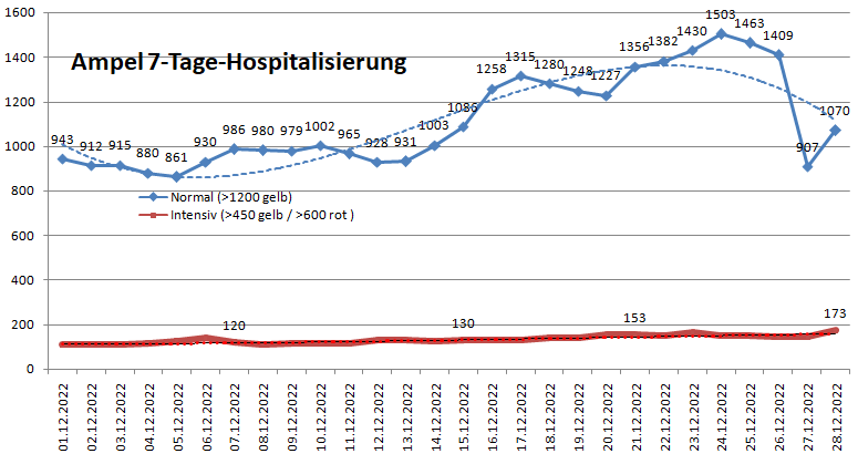Die bayernweite Intensivbettenbelegung liegt bei 173 (152/129/139 /114 /133).