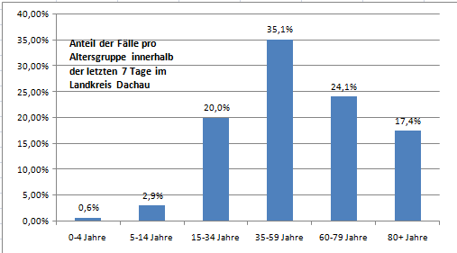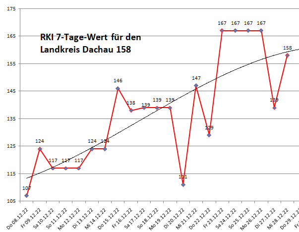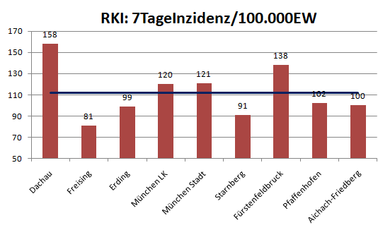 Der Landkreis Dachau liegt diese Woche mit einer Inzidenz von 158 (147/124/112/128) weit über dem Mittel der Nachbarlandkreise mit 112 (120/111/95/93).