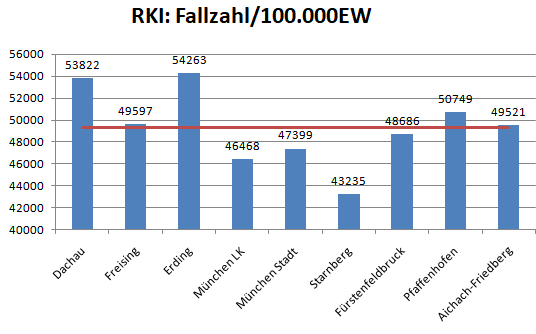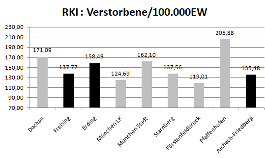 Im Vergleich mit den Nachbarlandkreisen steht nur Pfaffenhofen bei den Verstorbenen pro 100.000 Einwohner noch schlechter da als der Landkreis Dachau. Deutlich geringer ist der Wert für den Nachbarlandkreis Fürstenfeldbruck. Veränderte Werte gegenüber der Vorwoche in grau.