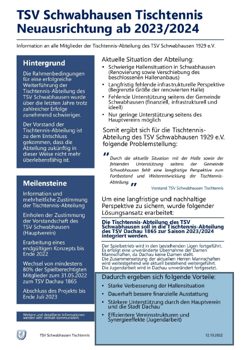 Am 12.10.2022 hat der Tischtennisverein Schwabhausen seinen Mitgliedern eine bessere Hallensituation und eine dauerhaft bessere finanzielle Ausstattung zugesagt, sowie eine stärkere Unterstützung der Stadt Dachau.