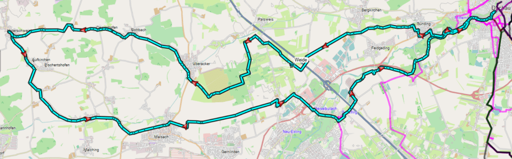 Unsere Tour führt uns am Amper-Ammer-Radweg an der kürzlich renaturierten Fläche der Stadtwerke vorbei. Es ist erstaunlich wieviel Leben sich in kürzester Zeit dort entwickelt hat. Weiter geht es über Maisach nach Unterschweinbach. Dort kehren wir beim „Schoambacher – Wirtshaus und Biergarten“ ein. Frisch gestärkt geht’s zurück nach Dachau. Auf unserem Weg liegt das Palsweiser Moos. Ein letztes Relikt des ursprünglichen Dachauer Moos – liebevoll gepflegt durch den Bund Naturschutz.