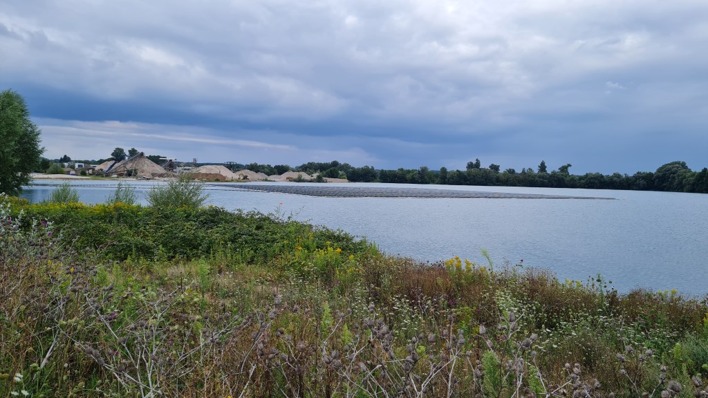 13.08.23 Eine schwimmende Photovoltaikanlage auf einem Baggersee bei Neupotz am Rhein in der Südpfalz. Schöne Urlaubsgrüße von einer wunderschönen Radltour durch die Rheinauen von Wolfgang und Kersten.