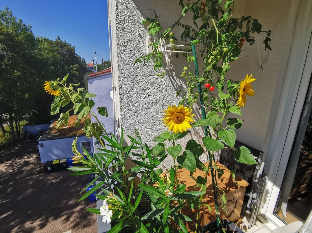 11..08.23 Im Hintergrund seht Ihr unser Schloss und davor den Maibaum an der Unteren Stadt. Besser wird die Welt mit Bio-Tomaten vom Balkon, umrahmt von Sonnenblumen und Oleander. Na ja, vielleicht wird die Welt nicht besser wegen der Tomaten – in jedem Fall aber, weil es mir besser geht, wenn ich auf dem Balkon entschleunigen kann.