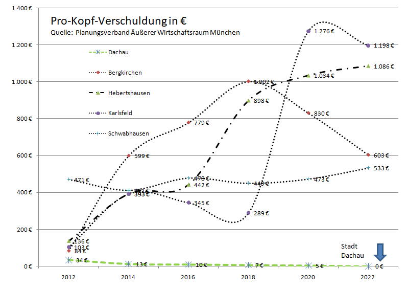 Man kann trefflich darüber streiten ob ein Pro-Kopf-Verschuldung sinnvoll ist oder nicht. Eine Pro-Kopf-Verschuldung von Null €uro, wie sie Dachau auch in diesem Jahr wieder erreicht hat, sagt aber wenig ohne entsprechenden Vergleich aus. Deswegen haben wir uns damit auseinandergestzt und die Daten von unseren Nachbargemeinden auf Basis der vom Planungsverband Äußerer Wirtschaftsraum veröffentlichten Zahlen in ein Diagramm eingetragen.
