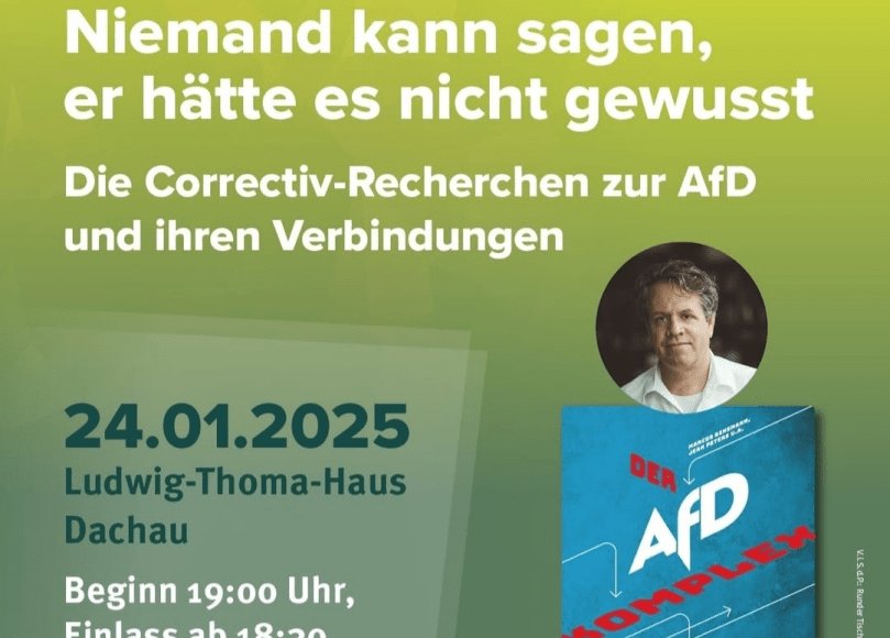 Der Investigativjournalist Marcus Bensmann ist Teil des Medienhauses von CORRECTIV und recherchiert seit 2016 zur AfD. Er kommt auf Einladung von Änderwerk und Runder Tisch gegen Rassismus am Freitag 24.01.2025 um 19 Uhr nach Dachau ins Ludwig-Thoma-Haus und spricht aus seinen Büchern „Niemand kann sagen, er hätte es nicht gewusst“ sowie „Der AfD-Komplex“ über die ungeheuerlichen Pläne der AfD.