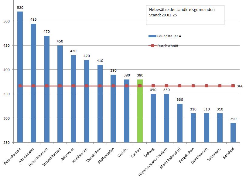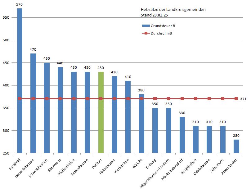 Karlsfeld liegt 199 und Hebertshausen 99 Punkte über dem Landkreis-Durchschnitt bei der Grundsteuer B, die Stadt Dachau liegt mit 59 Punkten über dem Schnitt im Mittelfeld.