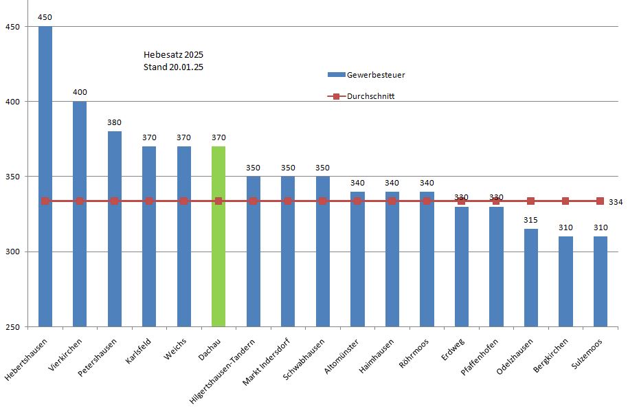 Hebertshausen liegt 116 Punkte über dem Landkreis-Durchschnitt bei der Gewerbesteuer, die Stadt Dachau liegt mit 36 Punkten über dem Schnitt im Mittelfeld.