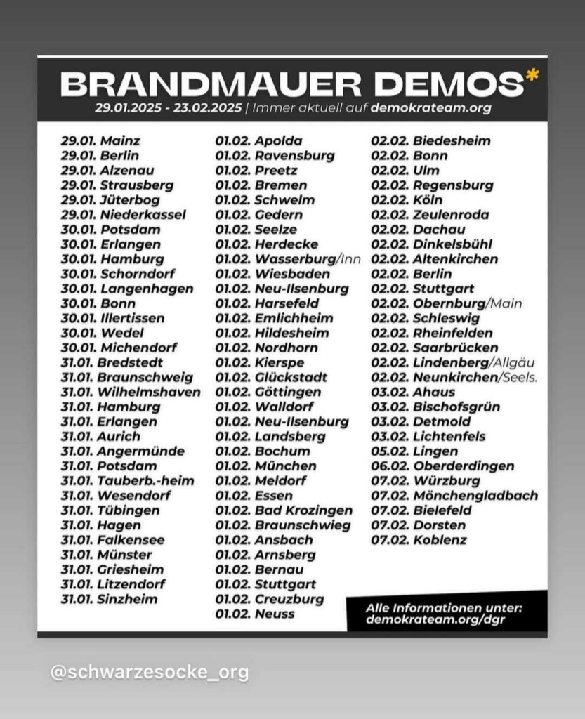Entsprechend der aktuellen Ereignisse wird die Demo am Sonntag zusammen mit vielen anderen Demos in ganz Deutschland zusätzlich zur Brandmauerdemo. Hier die Termine dazu: